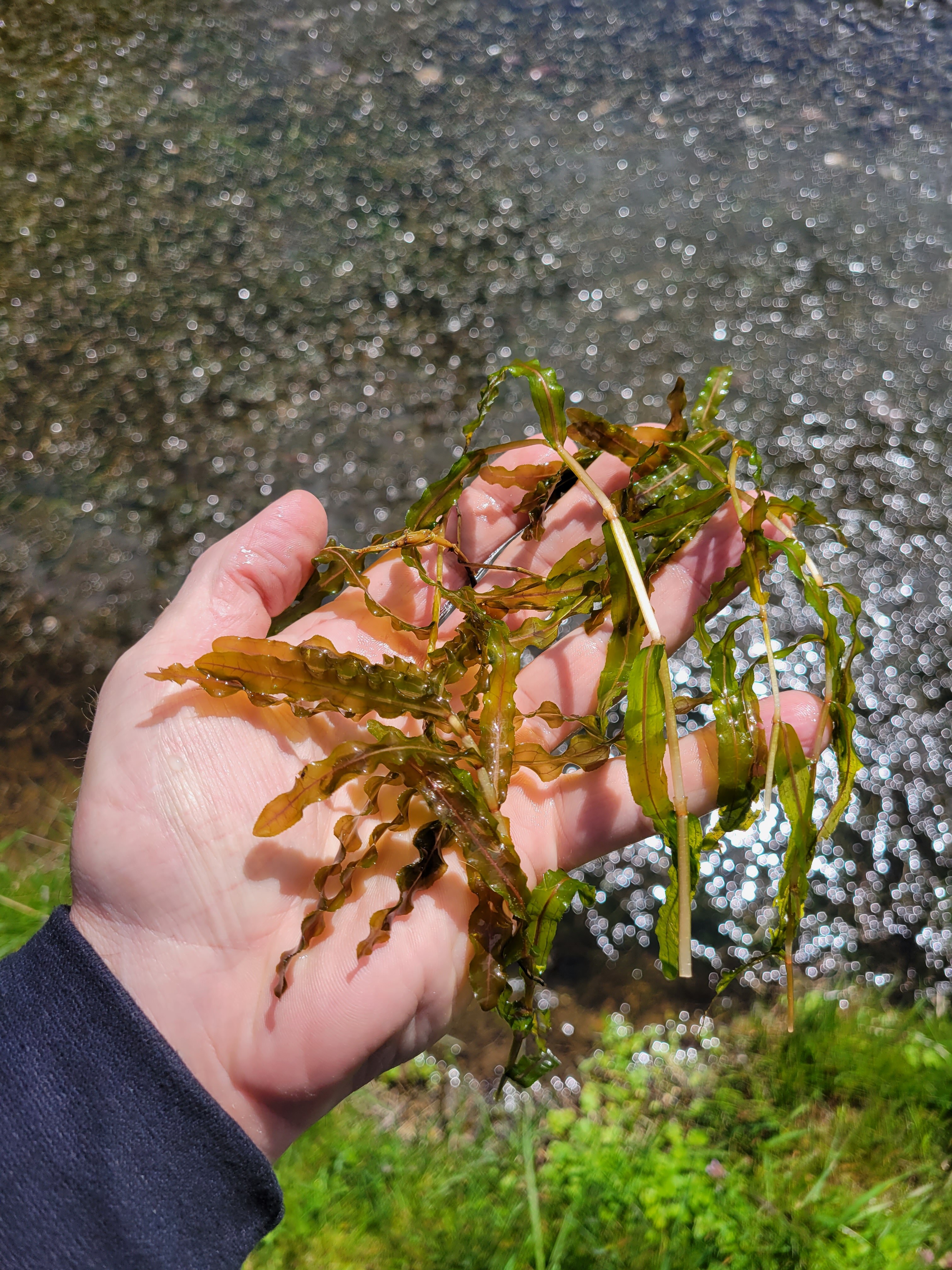 Curly-leaf pondweed is easily recognizable by its distinctive wavy, crinkled leaves.